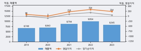 신원의 2023년 매출액은 전년대비 -16.2% 줄어든 8345억원이고, 영업이익 역시 전년대비 -29.8% 줄어든 234억원을 기록했다. 이 회사의 매출액 증감률과 영업이익 증감률은 각각 코스피 하위 16%, 하위 34%에 해당된다.