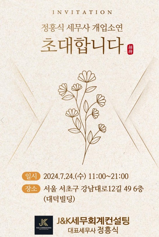 (조세금융신문=구재회 기자) 국세청에서 오랫동안 조사업무를 담당했던 정흥식 전 역삼세무서 조사과장이 오는 24일 J&K세무회계컨설팅 대표세무사로 새출발하는 개업소연을 갖는다.