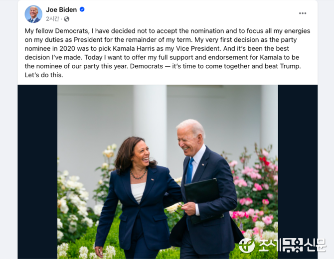 한편 제이미 해리슨 민주당 전국위원회 위원장은 바이든 대통령의 후보직 사퇴발표 후 다음 단계로 당 차원의 새로운 대선 후보 지명 경로를 곧 발표할 것이라고 밝혔다. 해리슨 의원은 <X(옛 트위터>에 “곧 미국 국민은 민주당의 다음 단계와 지명 절차에 대해 듣게 될 것”이라는 글을 올렸다.