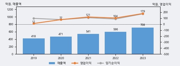 태경케미컬은 2023년 매출액 708억원과 영업이익 179억원을 기록했다. 전년대비 매출은 18.7%, 영업이익은 71.9% 각각 상승했다. 이 회사의 매출액 증감률과 영업이익 증감률은 각각 코스피 상위 14%, 상위 20%에 해당된다.