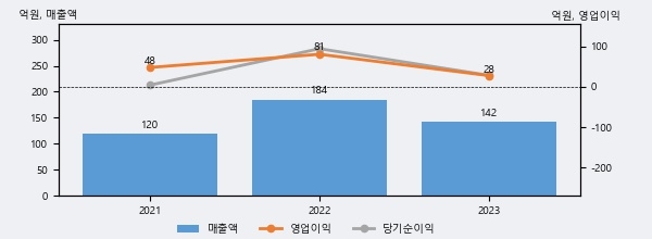 산돌은 2023년 매출액 142억원과 영업이익 28억원을 기록했다. 전년대비 매출은 -22.7%, 영업이익은 -65.5% 각각 하락했다. 이 회사의 매출액 증감률과 영업이익 증감률은 각각 코스닥 하위 18%, 하위 28%에 해당된다.