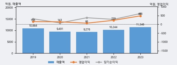 최근 실적을 살펴보면 2023년 매출액이 최근 5년 중 가장 높은 실적을 기록했음을 알 수 있다. 이전 최고 실적이었던 2019년 보다도 4.2%(461억 9천만원) 늘어난 것으로 나타났다.