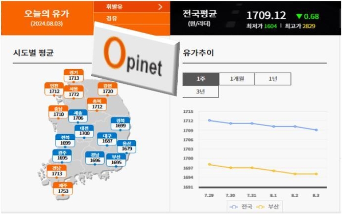 3일 한국석유공사 유가정보시스템 오피넷에 따르면 7월 다섯째 주(7월 28일∼8월 1일) 전국 주유소 휘발유 평균 판매가는 직전 주 대비 L당 2.5원 하락한 1천711.0원을 기록했다. 휘발유 가격은 6월 셋째 주 이후 5주 연속 오른 후 6주 만에 내림세로 돌아섰다.