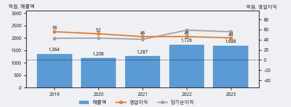 지에스이는 2023년 매출액 1688억원과 영업이익 44억원을 기록했다. 전년대비 매출은 -2.2%, 영업이익은 -5.4% 각각 하락했다. 이 회사의 매출액 증감률과 영업이익 증감률은 각각 코스닥 하위 46%, 상위 43%에 해당된다.