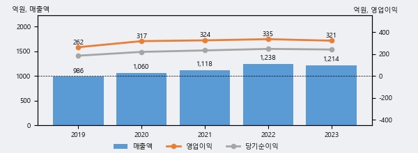 와이엔텍의 2023년 매출액은 전년대비 -1.9% 줄어든 1214억원이고, 영업이익 역시 전년대비 -4.1% 줄어든 321억원을 기록했다. 이 회사의 매출액 증감률과 영업이익 증감률은 각각 코스닥 하위 47%, 상위 43%에 해당된다.