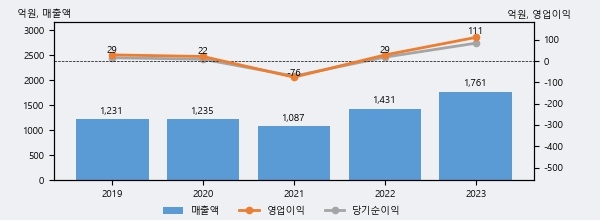 최근 실적을 살펴보면 2023년 매출액이 최근 5년 중 가장 높은 실적을 기록했음을 알 수 있다. 이전 최고 실적이었던 2022년 보다도 23.0%(329억 8천만원) 늘어난 것으로 나타났다.