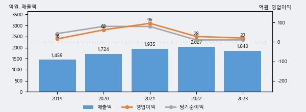 신일전자의 2023년 매출액은 1843억으로 전년대비 -9.1% 하락했고, 영업이익 역시 20억으로 전년대비 -29.0% 하락했다. 이 회사의 매출액 증감률과 영업이익 증감률은 각각 코스피 하위 27%, 하위 35%에 해당된다.