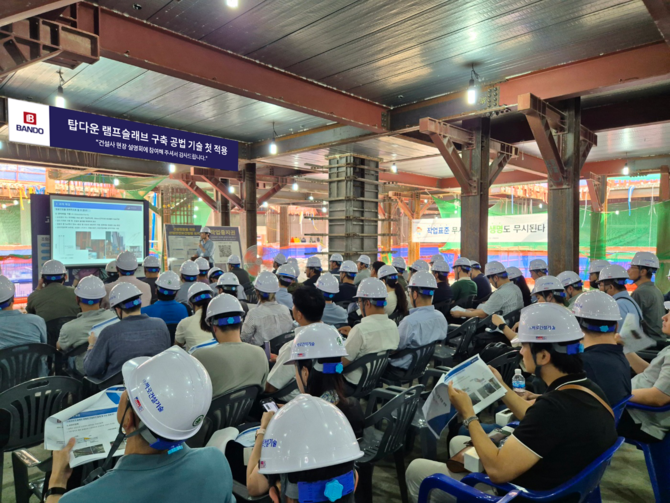 탑다운 램프슬래브 구축 공법에 대한 건설업계의 관심도 대단히 뜨겁다. 반도건설이 서대문 영천구역 재개발 현장에서 진행한 건설사 참여 설명회에 삼성물산을 비롯해 HDC현대산업개발, SK에코플랜트, GS건설, 대우건설 등을 포함한 총 60여개 건설사가 참석했으며, 공기 단축과 공사비 증가에 대한 건설업계의 새로운 타개점을 제시했다는 점에서 특히 이목이 집중됐다. 이 날 설명회에서는 신공법에 대한 상세한 기술 설명 및 질의, 건설 현장의 혁신과 발전 방향에 대한 논의가 이어졌다.