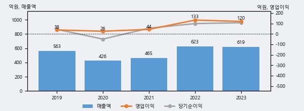 케이엔제이의 2023년 매출액은 전년대비 -0.6% 줄어든 619억원이고, 영업이익 역시 전년대비 -9.6% 줄어든 120억원을 기록했다. 이 회사의 매출액 증감률과 영업이익 증감률은 각각 코스닥 하위 49%, 상위 46%에 해당된다.
