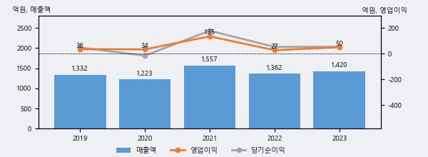 우리이앤엘의 2023년 매출액은 전년대비 4.3% 늘어난 1420억원이고, 영업이익 또한 전년대비 84.3% 늘어난 50억원을 기록했다. 이 회사의 매출액 증감률과 영업이익 증감률은 각각 코스닥 상위 42%, 상위 15%에 해당된다.