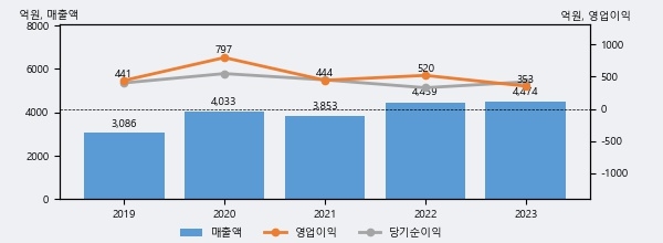 최근 실적을 살펴보면 2023년 매출액이 최근 5년 중 가장 높은 실적을 기록했음을 알 수 있다. 이전 최고 실적이었던 2022년 보다도 0.3%(15억원) 늘어난 것으로 나타났다.