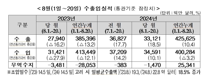 관세청은 21일 '8월1일~20일 수출입현황'을 발표하고 이 기간 수출액이 331억 2100만달러를 기록했다고 발표했다. 이는 전년 동기 대비 18.5% 증가한 수치다. 수입은 346억달러로 전년 동기 대비 10.1% 증가했다. 무역적자는 15억달러를 기록했다.