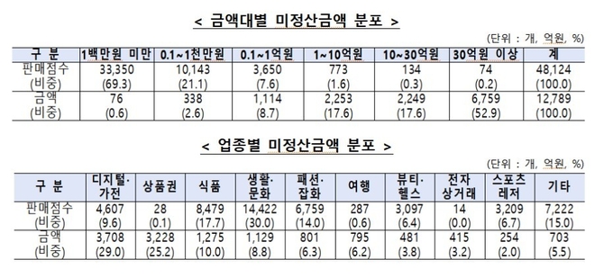 미정산 금액별로는 4만3천493개 업체(90.4%)가 1천만원 이하의 피해를 입었다. 전체 미정산액에서 차지하는 비중은 3.2%(414억원)였다. 미정산액이 1억원 이상인 업체는 981개사로 전체의 2.1%에 불과하지만, 피해액은 1조1천261억원으로 전체의 88.1%를 차지했다.