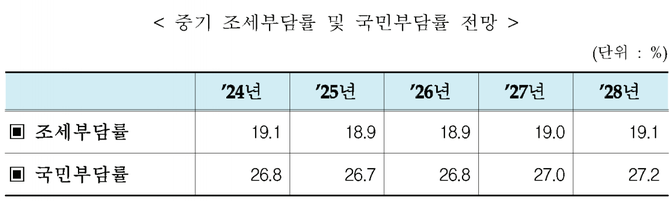 기획재정부가 27일 공개한 2024~2028 국가재정운용계획에 따르면, 중기 국민 (조세)부담률 전망은 2024년 GDP 대비 26.8%, 2025년 26.7%, 2026년 26.8%, 2027년 27.0%, 2028년 27.2%로 나타났다.