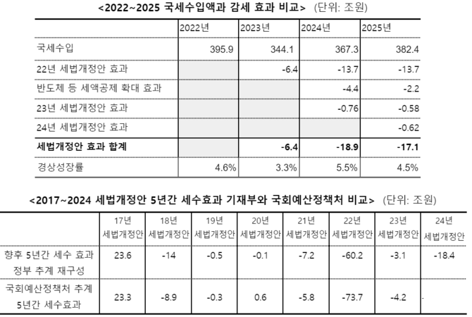 국회 예산정책처는 2022년 세법개정으로 인한 5년간 감세규모를 –73.7조원으로 추산했으며, 2023년 세법개정에 대해선 5년간 –4.2조원으로 추산했다.