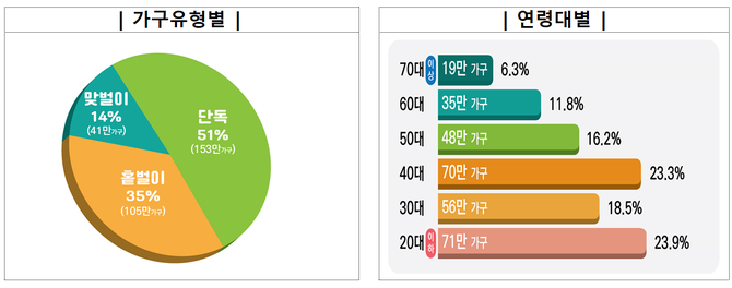 홑벌이 105만(35.1%), 맞벌이 41만(13.5%) 가구 순이며, 연령별은 20대 이하(23.9%), 40대(23.3%), 30대(18.5%), 60대 이상(18.1%) 순으로 나타났다.