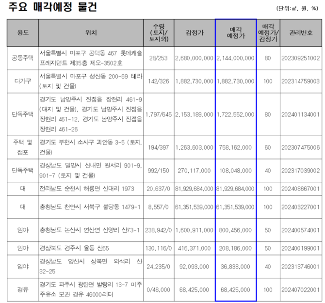 이번 공매에는 부동산 1702건, 동산 108건이 매각되며, 그 중 임야 등 토지가 1062건으로 가장 많은 비중을 차지한다. 또한, 아파트, 주택 등 주거용 건물도 서울, 경기 등 수도권 소재 물건 213건을 포함해 총 358건이 공매되고, 특허권, 출자증권 등 동산도 매각된다. 특히, 전체 물건 중 감정가의 70% 이하인 물건도 656건이나 포함돼 있어 실수요자들은 관심을 가져볼 만하다.