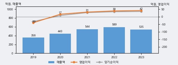 브리지텍의 2023년 매출액은 전년대비 -9.2% 줄어든 535억원이고, 영업이익은 전년대비 6.1% 늘어난 42억원을 기록했다. 이 회사의 매출액 증감률과 영업이익 증감률은 각각 코스닥 하위 35%, 상위 37%에 해당된다.