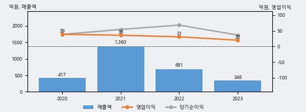 디티씨의 2023년 매출액은 346억으로 전년대비 -49.8% 하락했고, 영업이익 역시 20억으로 전년대비 -35.1% 하락했다. 이 회사의 매출액 증감률과 영업이익 증감률은 각각 코스닥 하위 5%, 하위 40%에 해당된다.