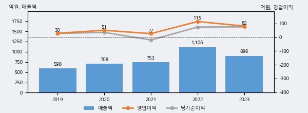 디케이앤디의 2023년 매출액은 898억으로 전년대비 -18.8% 하락했고, 영업이익 역시 82억으로 전년대비 -28.9% 하락했다. 이 회사의 매출액 증감률과 영업이익 증감률은 각각 코스닥 하위 22%, 하위 44%에 해당된다.