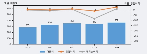 최근 실적을 살펴보면 2023년 매출액이 최근 5년 중 가장 높은 실적을 기록했음을 알 수 있다. 이전 최고 실적이었던 2021년 보다도 3.4%(11억 8천만원) 늘어난 것으로 나타났다.