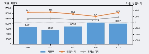 HDC현대EP의 2023년 매출액은 1조 81억으로 전년대비 -3.6% 하락했고, 영업이익은 330억으로 전년대비 62.0% 상승했다. 이 회사의 매출액 증감률과 영업이익 증감률은 각각 코스피 하위 40%, 상위 23%에 해당된다.