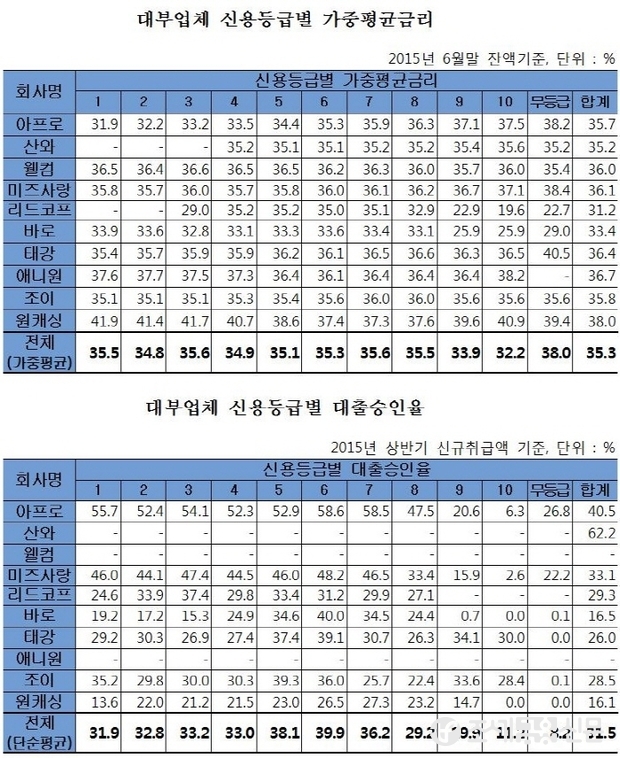 국회 정무위원회 소속 새정치민주연합 김기식 의원이 금융감독원으로부터 제출받은 국정감사 자료에 의하면, 대부잔액 기준 상위 10개 대부업체를 대상으로 신용등급별 가중평균금리를 조사한 결과, 2015년 6월 말 기준 10개 업체 전체 잔액 약 6.2조에 적용되는 가중평균금리는 35.3%에 달했다.