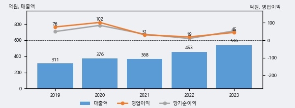최근 실적을 살펴보면 2023년 매출액이 최근 5년 중 가장 높은 실적을 기록했음을 알 수 있다. 이전 최고 실적이었던 2022년 보다도 18.4%(83억 3천만원) 늘어난 것으로 나타났다.