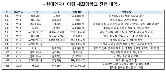 한편, 현대엔지니어링은 해외사업을 통해 인연을 맺은 지역 주민들을 위해 교육 인프라를 구축하는 사회공헌사업인 ‘새희망학교’를 꾸준히 진행해 오고 있다. 올해부터는 베트남에서 ‘13호 새희망학교’ 사업을 시작해 2026년까지 약 3년 동안 세이브더칠드런과 함께 베트남 북중부 지방인 타인호아성의 기후변화 대응을 지원할 계획이다.