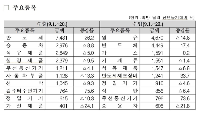 윤홍철 관세청 정보데이터정책관실 사무관은 "조업일수는 추석 연휴 등의 영향으로 13.0일에 그쳐 지난해 15.5일보다 2.5일이 적었으나 반도체와 컴퓨터 주변기기는 상승했다"고 설명했다.