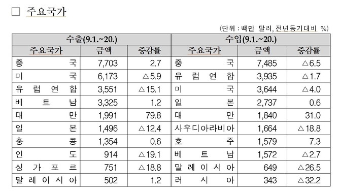 관세청은 23일 9월 1∼20일 수출입 현황을 발표하고 수출액(통관 기준 잠정치)은 355억8300만 달러로 지난해 동기 대비 1.1% 감소했다고 밝혔다. 이 기간 동안 수입은 347억 8400만달러로 4.5%가 감소했다.