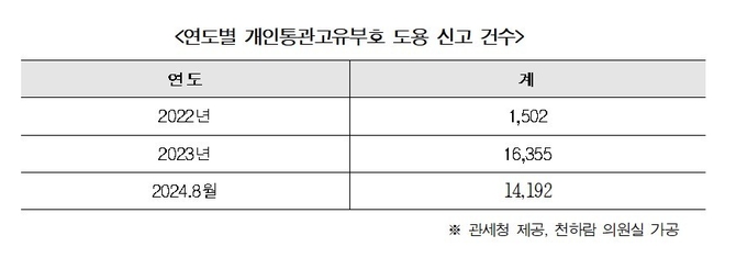 국회 기획재정위원회 소속 천하람 국회의원(개혁신당 원내대표)이 관세청으로부터 제출받은 자료에 따르면 2022년 1502건에 그쳤던 개인통관고유부호 도용 신고 건수는 작년 한 해 1만 6355건으로 10배 이상 폭증했다.