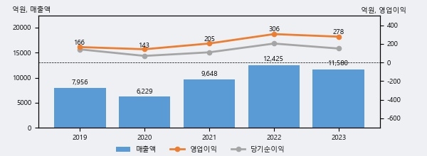 극동유화의 2023년 매출액은 전년대비 -6.8% 줄어든 1조 1580억원이고, 영업이익 역시 전년대비 -9.0% 줄어든 278억원을 기록했다. 이 회사의 매출액 증감률과 영업이익 증감률은 각각 코스피 하위 32%, 하위 45%에 해당된다.