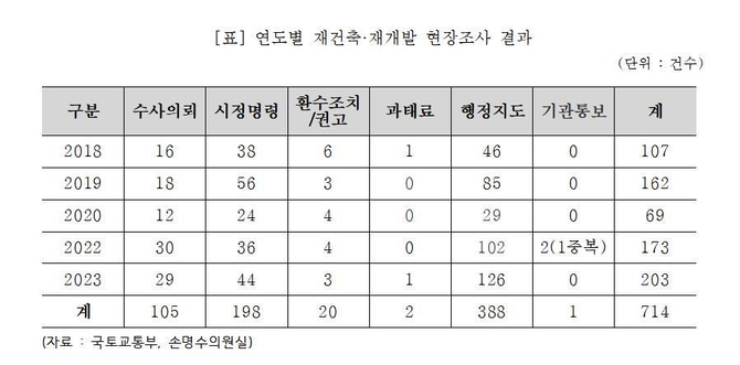 9일 국토교통부가 국회 국토교통위원회 소속 손명수 의원(더불어민주당)에게 제출한 국정감사 자료에 따르면 사회적 거리두기로 현장점검을 실시하지 않은 2021년을 제외한 2018∼2023년 국토부와 관할 지방자치단체가 시행한 합동점검에서 총 714건의 위반행위가 적발됐다.