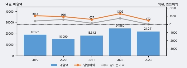 한솔제지의 2023년 매출액은 2조 1941억으로 전년대비 -10.7% 하락했고, 영업이익 역시 472억으로 전년대비 -63.7% 하락했다. 이 회사의 매출액 증감률과 영업이익 증감률은 각각 코스피 하위 25%, 하위 20%에 해당된다.
