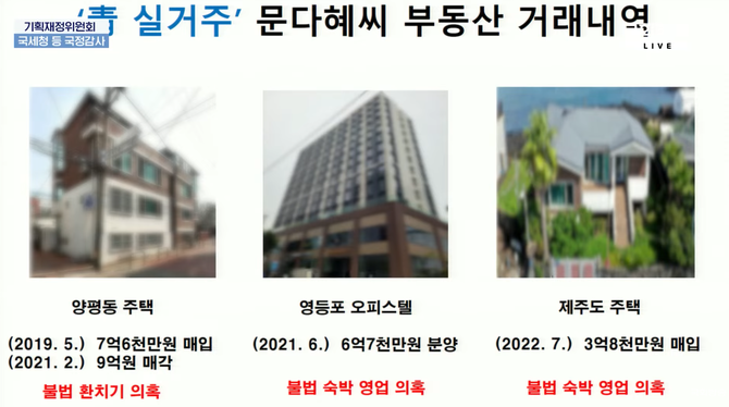 이날 구자근 국민의힘 의원은 다혜 씨는 주택거래 과정에서 환치기 수법으로 자금 일부를 조달했고, 추가로 서울 영등포구의 다가구주택 및 오피스텔, 제주도 주택 등을 매입했다고 의혹을 제기했다.