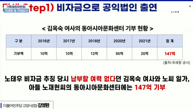 동아시아문화센터의 경우 김옥숙 여사가 2016년부터 2021년까지 수 차례에 살펴 총 147억을 출연했다.