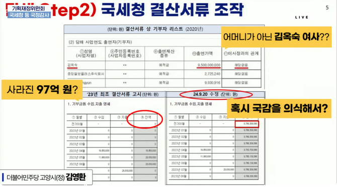 재단의 국세청 공시도 부실했는데, 2020년 김옥숙 여사가 아들 재단에 95억원을 기부하면서도 서류상으로는 마치 남이 기부한 것처럼 꾸몄다.