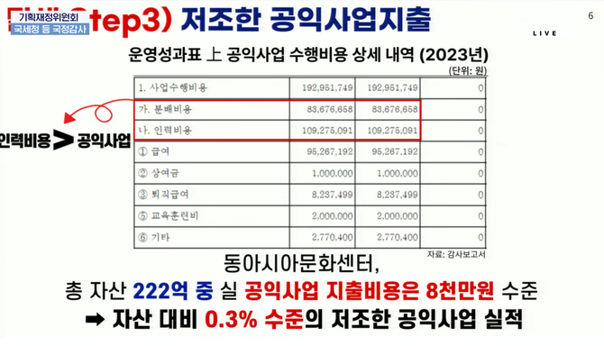 2023년 국세청 홈택스에 올린 동아시아문화재단 결산서류를 살펴보면, 총 자산은 약 222억원 중 약 91.7억원은 부동산 관련 투자, 약 55억원은 금융상품 투자였다, 반면 공익사업에 쓴 돈은 1.9억원에 불과했다.