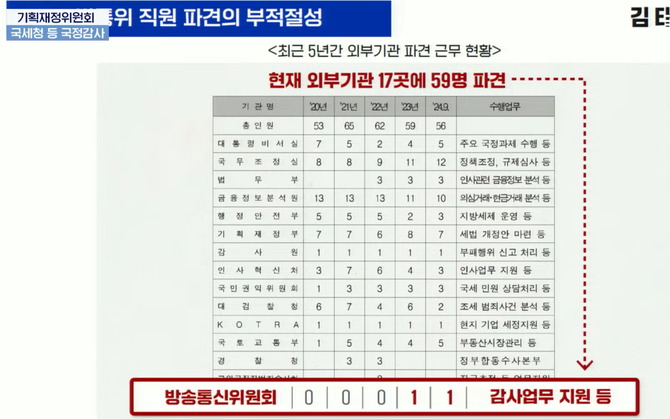 김태년 의원은 “2020년 교육부 (국세청) 파견은 사학비리 타파란 목적이 명백하다. 이번 방통위 파견은 목적이 불분명하다”라며 “방송장악을 위한 정치감사하기 위해 사정기관 파견을 받은 거다”라고 반박했다.