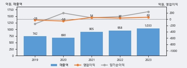 오상자이엘은 2023년 매출액 1033억원과 영업이익 63억원을 기록했다. 전년대비 매출은 7.8%, 영업이익은 72.8% 각각 상승했다. 이 회사의 매출액 증감률과 영업이익 증감률은 각각 코스닥 상위 36%, 상위 18%에 해당된다.