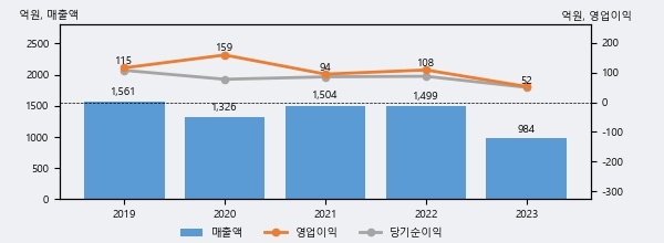 라이온켐텍의 2023년 매출액은 984억으로 전년대비 -34.4% 하락했고, 영업이익 역시 52억으로 전년대비 -51.5% 하락했다. 이 회사의 매출액 증감률과 영업이익 증감률은 각각 코스닥 하위 28%, 하위 44%에 해당된다.
