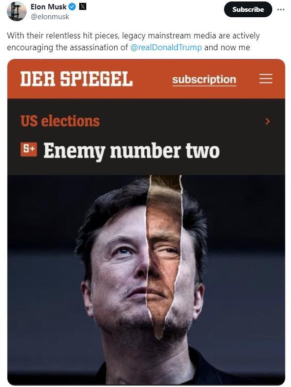 머스크는 이에 대해 "기존의 주류 미디어는 도널드 트럼프와 나에 대한 암살을 적극적으로 부추기고 있다"고 비난했다.