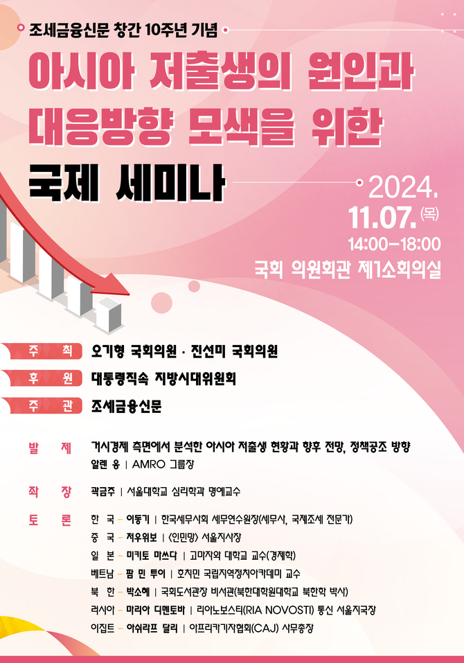 오는 11월 7일 오후 2시부터 국회 의원회관 제1소회의실에서 ‘아시아 저출생 원인과 극복방안 모색’을 주제로 개최하는 이번 세미나는 조세금융신문이 주관하며 오기형 더불어민주당 의원과 진선미 더불어민주당 의원이 주최한다.
