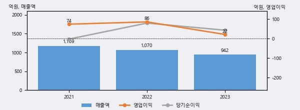 삼기이브이는 2023년 매출액 942억원과 영업이익 22억원을 기록했다. 전년대비 매출은 -12.0%, 영업이익은 -75.0% 각각 하락했다. 이 회사의 매출액 증감률과 영업이익 증감률은 각각 코스닥 하위 1%, 하위 1%에 해당된다.