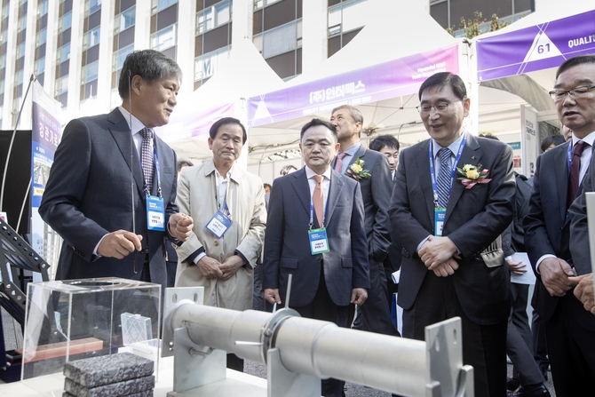 현대건설 본관 전시 부스에는 플랜트, 건축재(내외장재), 전기·설비·배관, 철근·콘크리트·PC, 토목, 안전, 모듈공법·소방 등 총 70개 기업이 참여해 기술과 제품을 전시했다.