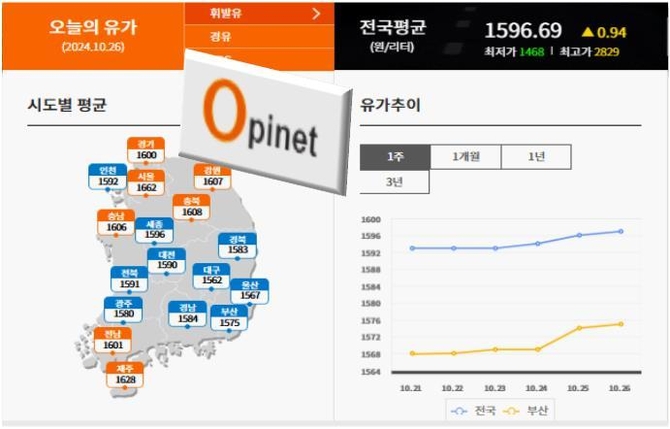 26일 한국석유공사 유가정보시스템 오피넷에 따르면 10월 넷째 주(20∼24일) 전국 주유소 휘발유 평균 판매가는 직전 주 대비 L당 1.5원 상승한 1천593.1원을 기록했다.
