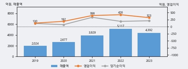 제이씨케미칼의 2023년 매출액은 4392억으로 전년대비 -14.2% 하락했고, 영업이익 역시 323억으로 전년대비 -24.3% 하락했다. 이 회사의 매출액 증감률과 영업이익 증감률은 각각 코스닥 하위 28%, 하위 46%에 해당된다.
