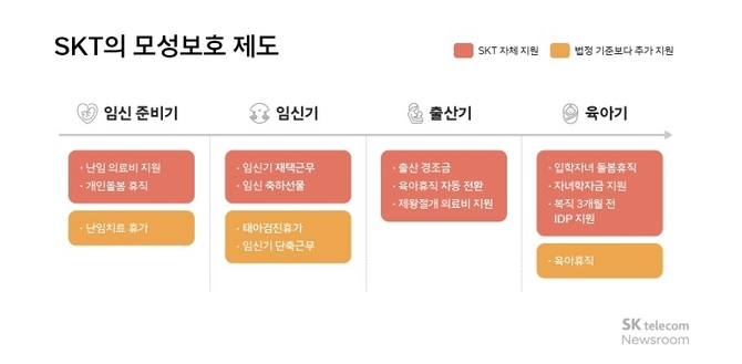 지난 2020년 10월 SK텔레콤은 남녀 구성원 모두 육아휴직을 최대 2년까지 사용할 수 있도록 제도를 개선했다. 이에 더해 임신 전 기간 동안 근로시간 단축 신청 가능, 최장 90일간 초등학교 입학 자녀 돌봄 휴직 제도 등의 복지 제도를 운영 중이다.