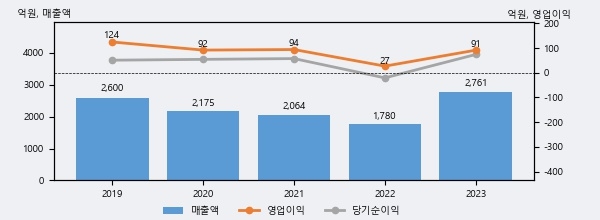 최근 실적을 살펴보면 2023년 매출액이 최근 5년 중 가장 높은 실적을 기록했음을 알 수 있다. 이전 최고 실적이었던 2019년 보다도 6.2%(161억원) 늘어난 것으로 나타났다.